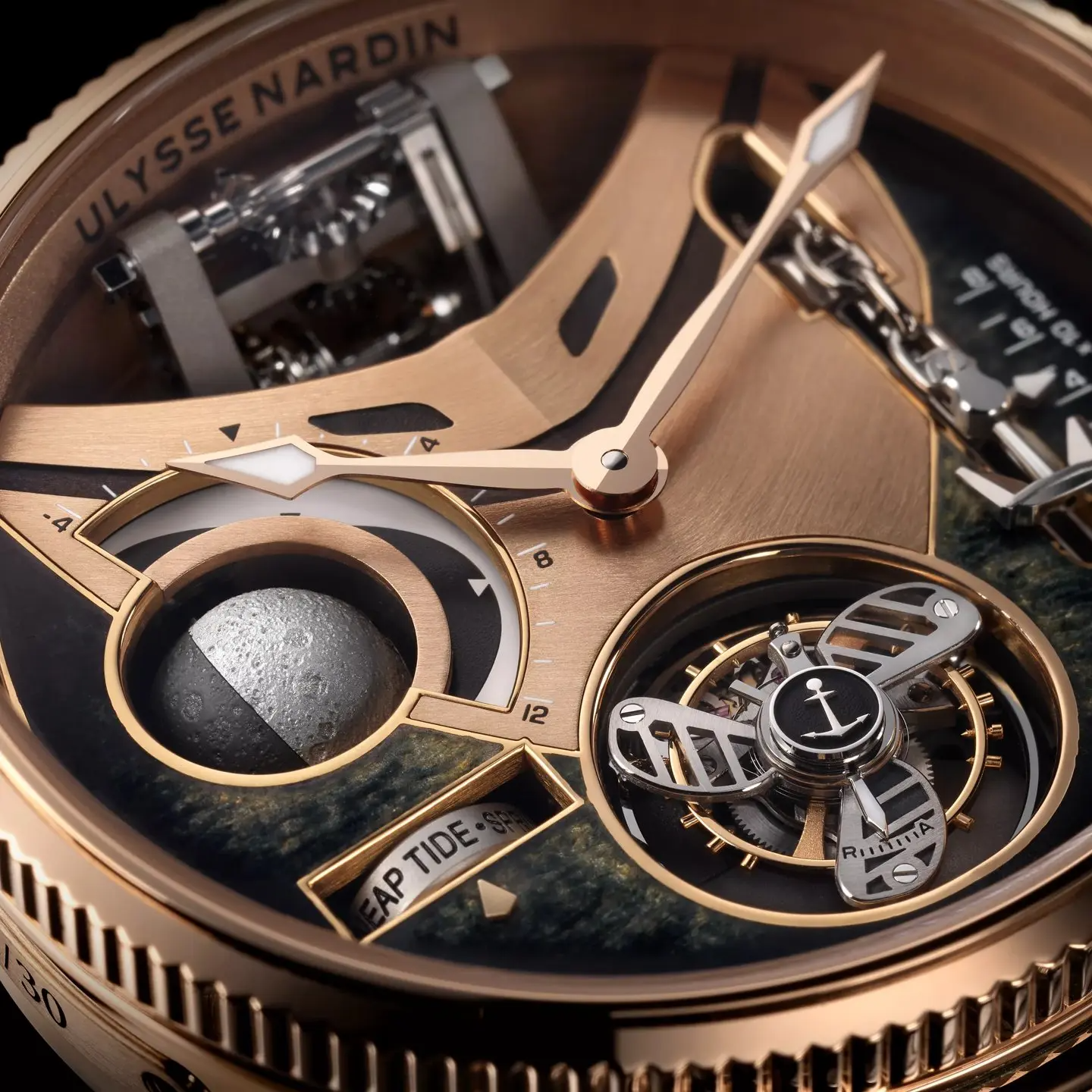 Fonksiyonlar: Saat ve dakika. Kurma mekanizmasına bağlı çapa ve ırgat ile güç rezervi. Ay evresi göstergesi. Gelgit katsayıları ve hacimlerinin göstergesi. Uçan turbiyon.