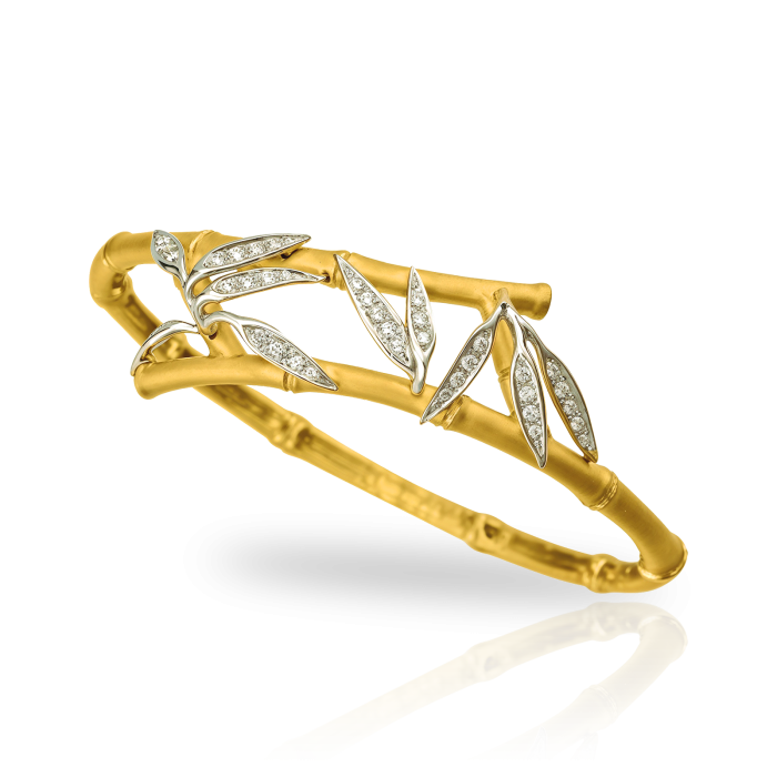 Bambú koleksiyonundan 18 Ayar Sarı ve Beyaz Altın ve Pırlantalı Bambú Bileklik ile tarzınızı yükseltin. Bu zarif mücevher bileziği, sarı altının zenginliğini, göz kamaştırıcı pırlantalarla süslenmiş beyaz altının zarif zarafetiyle birleştiriyor. Ortalama 23 gram ağırlığıyla, her topluluğa bir sofistike dokunuş katan lüks bir aksesuardır.